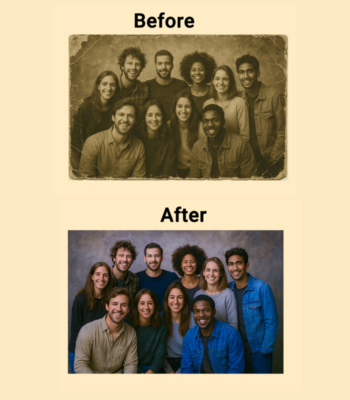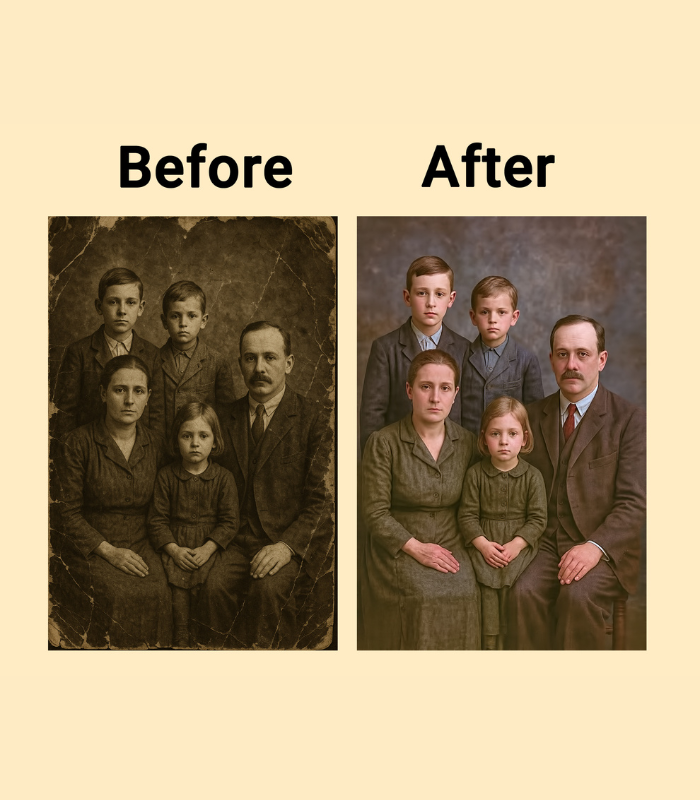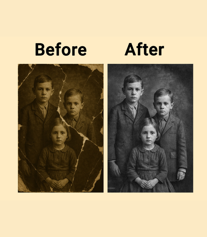 We specialize in restoring old, damaged, and faded photographs with a blend of advanced digital tools and artistic precision. Every picture tells a story, and our goal is to protect yours. Whether it’s a cherished family portrait, a childhood memory, or a moment in history, we transform worn-out images into vibrant, high-quality photographs you can proudly share and pass down for generations.